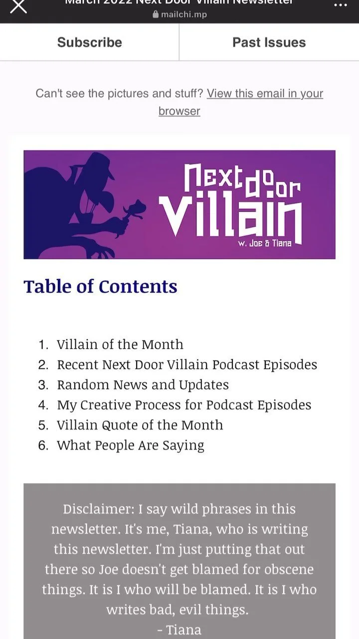 At the end of almost every episode, Joe and Tiana explore various creative mediums to try and understand that villain from a new perspective. These have been poems, short stories, monologues, and even an ad-lib once. If you are a writer or creative type, we encourage you to head over to the submission page to learn how you can write a piece and be featured on our show!